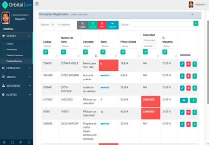 La flexibilidad es clave. Los productos o servicios que das de alta directamente desde una factura o un presupuesto se añaden automáticamente a tu catálogo. El stock se actualiza en tiempo real con cada venta y se restaura con cada anulación, asegurando que tus datos sean siempre precisos.